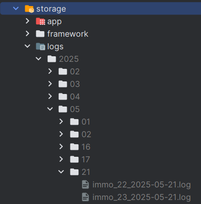 Exécutez cette méthode (par exemple, via une route /test-log). Vous devriez voir un fichier créé dans storage/logs/2025/05/24/ avec un nom comme immo_14_2025-05-24.log (si exécuté à 14h). Le contenu du fichier ressemblera à ceci :
