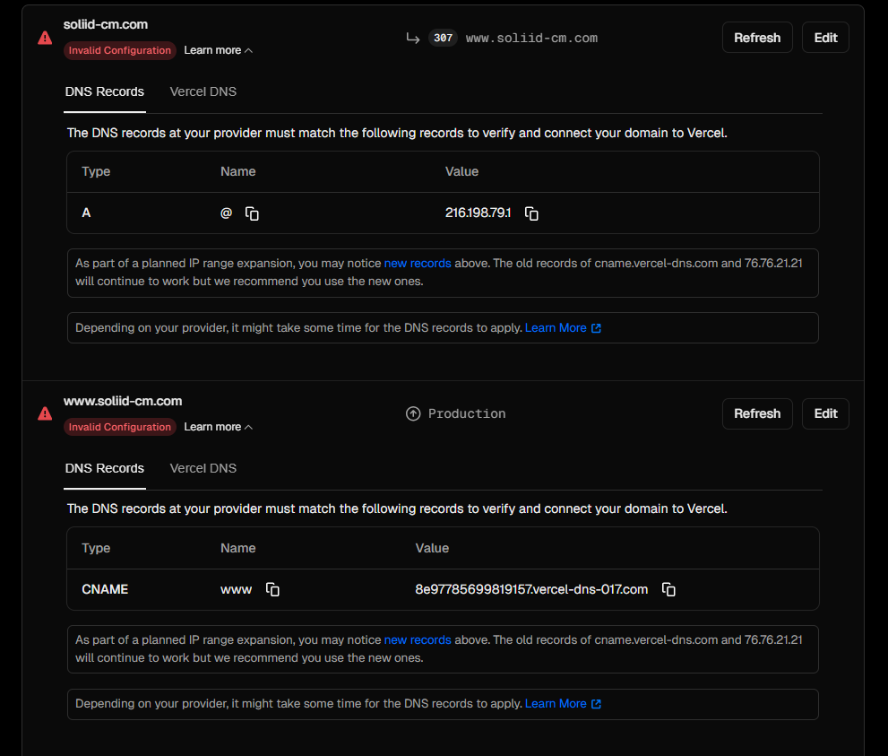 Comme solution j'ai essayer de configurer les DNS de mon domaine comme vercel demande mais j';ai des erreur chez mon hebergeur,