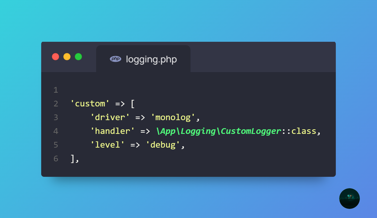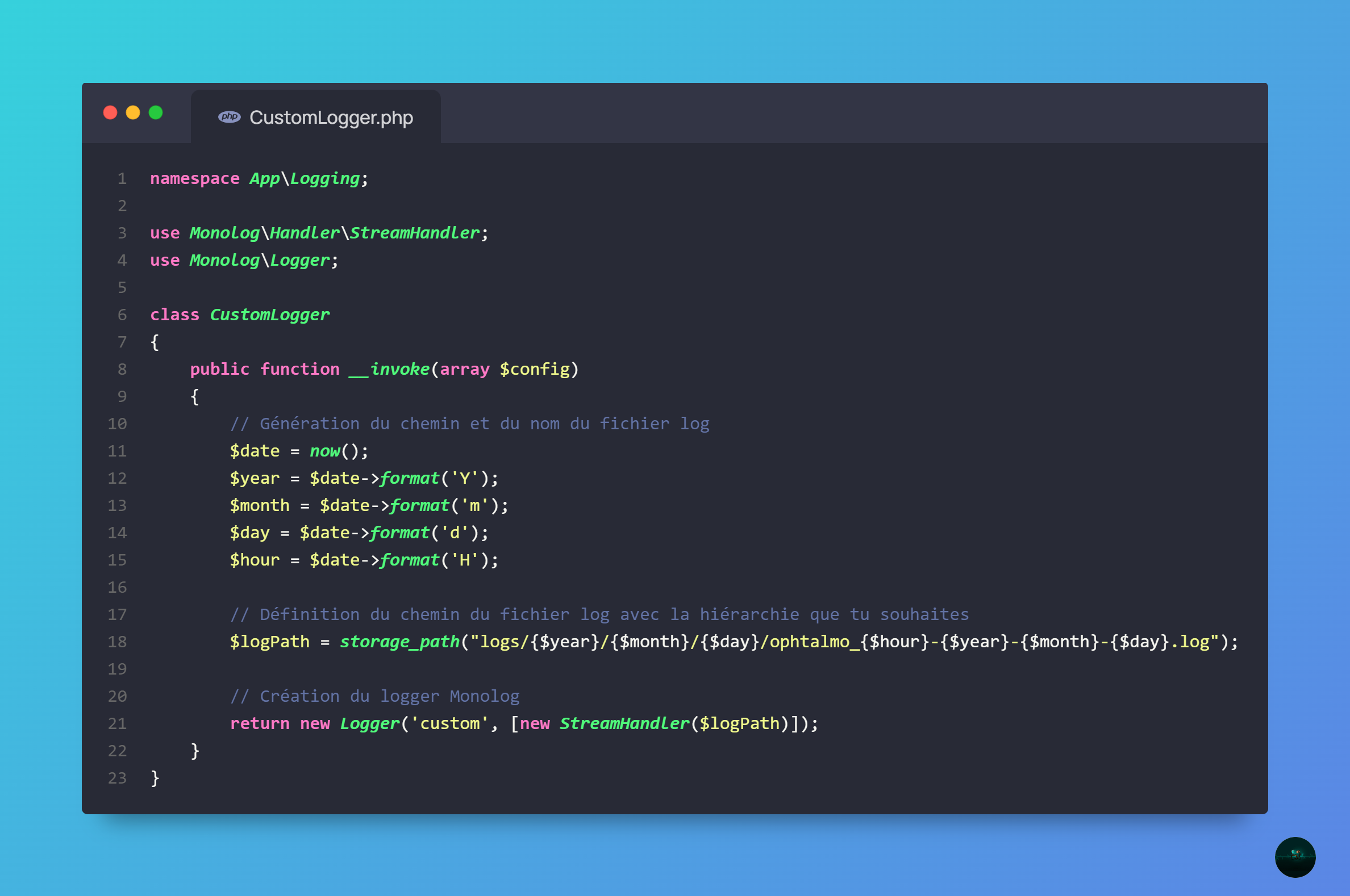 1'custom' => [2 'driver' => 'single',3 'path' => storage_path('logs/' . date('Y/m/d') . '/ophtalmo_' . date('H') . '-' . date('Y-m-d') . '.log'),4 'level' => 'debug',5 ],1'custom' => [2 'driver' => 'single',3 'path' => storage_path('logs/' . date('Y/m/d') . '/ophtalmo_' . date('H') . '-' . date('Y-m-d') . '.log'),4 'level' => 'debug',5 ],
